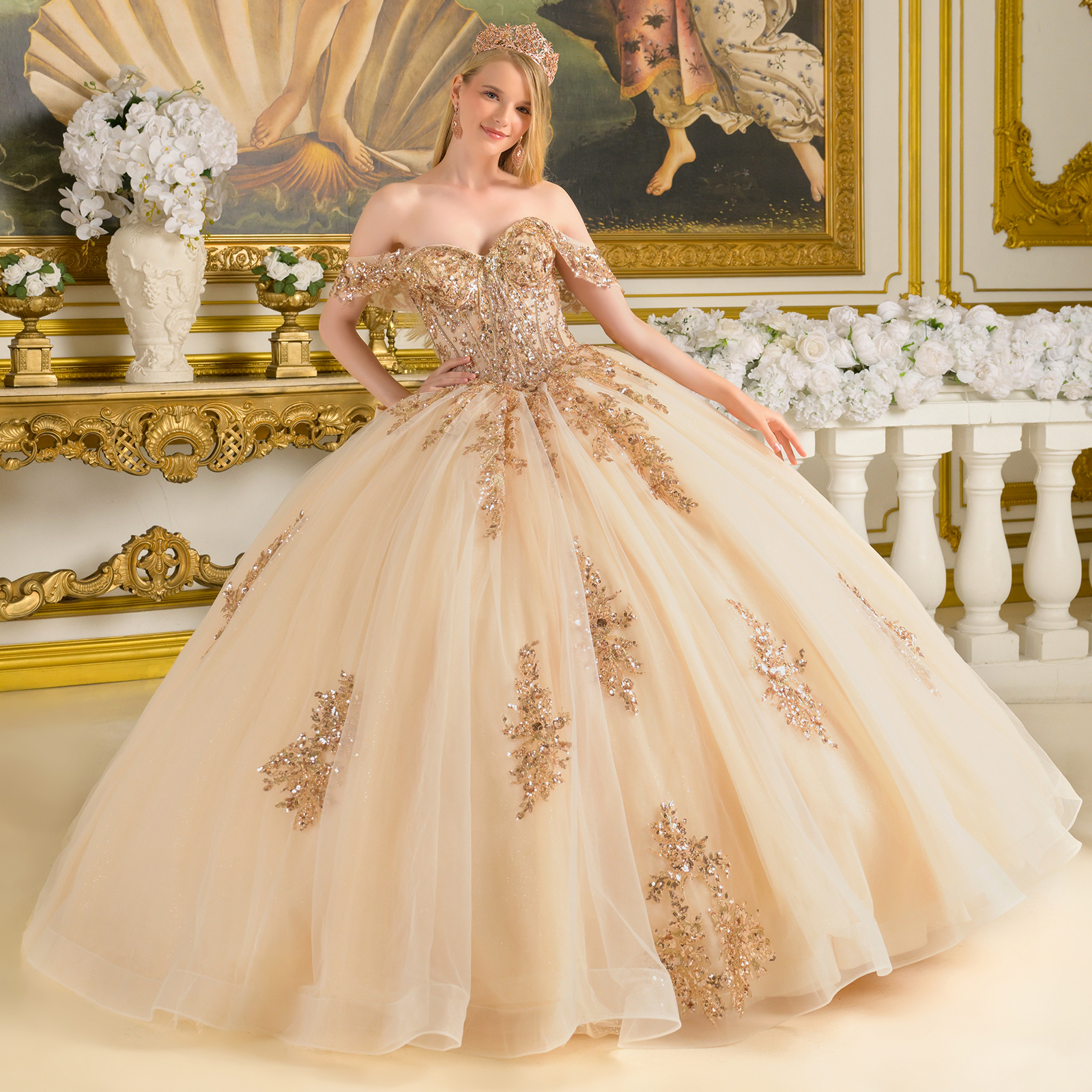 Vestido de Quinceañera con corpiño tipo corsé y tirantes caídos sobre los hombros, ojales adornados con pedrería, cola y lazo trasero desmontable